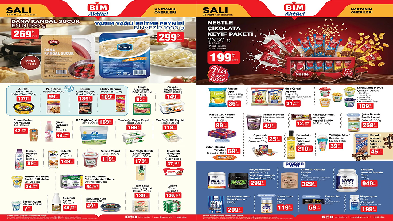 Patates cipsi, mısır çerezi çeşitleri, kurutulmuş meyve çeşitleri, orman meyveli bisküvi, şeker ilavesiz fındık ezmesi, oyuncaklı yumurta, ahududu aromalı kolajen, kurabiye aromalı protein tozu ve fıstık ezmesi gibi ürünlerin yer aldığı 31 Mart tarihinden itibaren geçerli olacak BİM kataloğu yayınlandı.